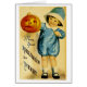 Illustration vintage de la carte de voeux d'Halloween montrant un enfant tenant un jack o'lanterne.