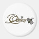Queen Bee Kühlschrank Magnet - Ein dekorativer Goldtext-Magnet mit einem kursiven Wort: Queen. Zwei kleine Bienen, die mit silber und goldfarbenem Glitzer kreiert wurden, schmücken den Text. Der Hintergrund ist massiv weiß.