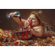 "Queen of Gluttonous Decay" farbiges Portrait. Ein dunkel humorvolles und grotesk Porträt, das die Folgen unkontrollierter Nachlässigkeit symbolisiert. Dieses surreale Kunstwerk stellt eine Frau dar, die grotesk in einen Hexenhaufen inmitten eines Berges aus Süßigkeiten und Wein verwandelt wurde und die Exzesse der Konsumkultur und der persönlichen Vernachlässigung verkörpert.