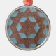 Quilt Block in braunem und blauem "Schloss" Muster. Die zentrale Burg ist eine braune Sternform, umgeben von der "6-seitigen Mauer" mit den "Uhrentürmen", die sich von der Mitte der Wände ausbreiten.