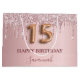 Elegant, klassisch, glamourös und mädchenhaft für eine Quinceañera, 15. Geburtstagsfeier. Ein schick rot rosa Farbverlauf Hintergrund. Dekoriert mit Imitaten Glitzer Tropfen, Farbe Tropfausdruck aussehen. Personalisieren und einen Namen hinzufügen. Mit dem Text: Happy Birthday. Der Name ist mit einem modernen, dunklen Rose gefärbten Handschrift geschrieben. Nummer 15 wird mit einem Schriftart im Ballonstil geschrieben.