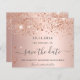 Eine gmädchenhafte und trendige Save the Date-Karte für eine Quinceañera, 15. Geburtstagsfeier. Ein feminin rosa, Rose Gold Imitate metallisch aussehend Hintergrund mit Imitaten Rose Gold Glitzer Staub. Personalisieren und fügen Sie Datum und Name/Alter hinzu. Dunkle Rose goldfarbene Buchstaben. Der Text: Save the Date ist mit einem großen angesagten, handgeschriebenen Stilskript geschrieben.
