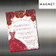 Eine moderne, stilvolle und glamouröse Magnetkarteneinladung für eine Quinceañera, 15. Geburtstagsfeier. Weißer Hintergrund mit Glitzern, rotes Kleid und rote Rosen, Blumenmuster. Der Name ist mit einem modernen handgeschriebenen Stilskript geschrieben. Personalisieren Sie Ihre Party-Daten und fügen Sie sie hinzu.