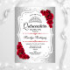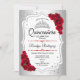 Silver Weiß Quinceanera Feier Einladung. Enthält Skript-Schriftart, rote Rosen, Tiara und Konfetti. Klassisches Design mit Imitaten Glitzer Silber. Ideal für eine elegante Glasfeier im Prinzessinnstil. Personalisieren Sie Ihre persönlichen Daten. Gedruckte Zazzle-Einladungen oder Sofortdownload digitaler Druckvorlage.