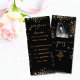 Programme de fête d'anniversaire sur le devant et un quix, jeu sur le dos. Personnalisez et ajoutez un nom, un âge, une date, un programme sur le pont et un quiz sur le dos. Un arrière - plan noir chic, décoré avec de la poussière de parties scintillant imitation. Lettres de couleur dorée. Conseil : Si vous avez beaucoup de texte, vous pouvez supprimer la photo et ajuster le texte.
