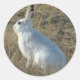 Schneeschuh Hare rund Sticker. Manchmal wird sogar Mutter Natur Plan durch das Wetter aufgefüllt, dieser Schneehase hat sich in seinen weißen Wintermantel verwandelt, aber die Winterschnee ist spät, und anstatt getarnt zu werden, sticht er jetzt gegen die braunen Präriegras hervor.