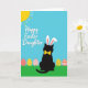 This design shows a stylized black cat in silhouette, seen from behind as if pausing to watch a sweet little scene unfold. The cat wears tall rabbit ears outlined in white with pink accents and a sunny yellow bow tie, giving it a friendly, affectionate look 🐰. In front of the cat, five decorated eggs sit in a row on bright green grass, like a small parade meant to be admired together. The eggs feature coral and warm yellow patterns such as dots and zigzags, and their close spacing suggests a cozy, companionable moment. In the upper left, a golden sun with simple rays adds warmth to the open, clear blue sky. Across the sky, the words “Happy Easter Daughter” appear in flowing white lettering, floating above the scene rather than sitting in a border. The sky stays uncluttered, with the sun glowing near the top left and the white message centered across the blue 🌷.