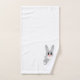 Bath towel set, consisting of a face cloth, hand towel and bath towel with a rabbit design. You can have this bath towel set in any colour by changing the background just click the edit this design button and choose the colour of your choice. You can also customise the text to read whatever you want. Should you require any help with customising then contact us through the message link on this page. Rabbit design bathroom towel set
