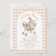 A sweet little bunny is on the way! This charming watercolor baby shower invitation features an adorable baby bunny cuddled in a vintage-style pram with a soft beige gingham border. Designed in warm neutral tones with a cozy hand-painted aesthetic, this invite is perfect for neutral baby showers, gender surprise celebrations, woodland themes, or classic nursery style events. Personalize effortlessly with your party details to create a beautiful keepsake guests will love. 🤍