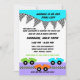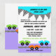 Adorable Race Auto Thema Baby Dusche Einladung in lustigen neutralen Farben von leuchtend aqua blau, lila und orange mit schwarz-weiß Schachbrett Flagge bunte und bunte Rennwagen.