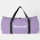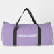 Dieser große Duffelbeutel ist in einer kräftigen Lavendelfarbe mit schwarzen Gurten zu sehen. Mit einem Rennfahnen-Druck gezeigt. Passen Sie dieses Objekt an oder kaufen Sie es wie gezeigt. Lizenzierte Printwerbung