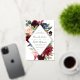 Unsere Hochzeitseinladung von Radiant Bloom umgibt Ihre Hochzeitsdetails mit einem geometrischen Rahmen von bemalten Aquarellfarben-Blume in bordeauxroter Marsala, rot-rosa und marineblau, mit grünem Eukalyptus-Blattwerk. Eine moderne und Bio Wahl in Grün und Weiß mit üppigen, farbenfrohen Botanicals und handgeschriebenen Schriften, mit luxuriösem Goldfoliendesign.