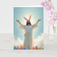 This card shows a robed figure in glowing white standing with arms outstretched, chin tilted upward as if meeting the light, and a radiant sunburst behind the head forming a soft halo. Tall, fluffy white bunny ears with pale pink interiors sit on top, adding a gentle, friendly touch 🐰. The scene is viewed from a low angle, so the figure rises against a wide blue sky where thin, feathery clouds drift by. In the foreground, smooth egg-shaped objects in pastel blue, pink, yellow, and purple nestle in fresh green grass, like small gifts placed close together 🌷. The robe’s flowing folds catch highlights and shadows, and the figure’s open posture suggests a welcoming bond, as though reaching out to someone just beyond the frame. A short line of text sits centered near the top in soft gold, with a smaller line near the bottom in light gray. The sunburst rays spread outward in pale yellow behind the head, while the pastel eggs cluster along the lower edge of the scene.