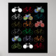 Eine grafische Darstellung von Farbrädern. Eine Komposition von Fahrrädern verschiedener Farben und Stile auf schwarz