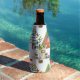 Ce glacière de bouteille a un design moderne du milieu du siècle des arbres de Noël dans différents styles. L'une a une grille avec des rectangles avec des éclats à l'intérieur. Un autre comporte des rectangles arrondis avec des rectangles plus petits à l'intérieur. Un troisième a des lignes courbes avec des étoiles sur elles. L'arbre final est un triangle avec d'autres petits triangles à l'intérieur.