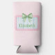 This cute can cooler features a pink frame with blue and white stripes and topped with a preppy green and white gingham plaid bow on each side. Personalize with your choice of name or special text on the front and back. Fun for personalized party favors and gift bags.