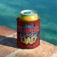 Super Dad Mustache Modern Grunge Can Cooler présente le texte "Super Papa" dans la typographie moderne rouge et jaune sur un arrière - plan gris bleu et rouge accentué d'une moustache. Créé par Evco Studio www.zazzle.com/store/evcostudio