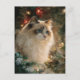 Celebrate the season with this enchanting feline portrait. A fluffy, blue-eyed cat sits nestled among snow-dusted pine branches and glowing string lights.