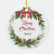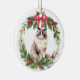 Dieses Holiday-Ornament besticht durch ein schönes Aquarellporträt einer Ragdoll-Katze mit hellblauen Augen. Das Katzenbild ist gerahmt mit einem heiligen und roten Beerenkranz, oben mit einem kräftigen roten Bogen. Die Rückseite des Ornaments hat den gleichen roten Bugkranz, mit zwei Textfeldern, die Sie anpassen können.