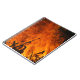 Ein Haufen silhouettierter Sticks auf der links Bildseite brennen heiß. Die dunkelorangen und gelben Flammen, die das Merizing bilden, füllen den größten Teil des Bilderrahmens. Der Wind drückt den Flammentorrent so, dass er schräg nach rechts abbiegst. Digitales, Farbfoto. Copyright © 2010 Claire E. Skinner. Alle Rechte vorbehalten.