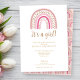 Ein niedliches "Es ist ein Mädchen!" Baby Dusche Einladung mit einer rosa und goldfarbenen boho Regenbogenillustrierung. Das Rainbow-Design ist auch auf der Rückseite der Karte sichtbar. Passen Sie Ihre Daten an, um Ihre Gäste über Ihre Veranstaltung zu informieren.