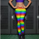 Niedliche Regenbogen-gemusterte Leggings mit leuchtend roten, orangefarbenen, gelben, grünen, blauen und lila horizontalen Streifen. Das perfekte Hosenpaar zum Anziehen bei einer Stolzparade oder LGBT Stolz März. Das sind mutig und macht Spaß!