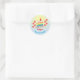 Aufkleber mit einem lächelnden Regenbogenkuchen, der einen Party-Hut trägt. Das Design zeigt den Namen des Geburtstagskindes und eine fröhliche Geburtstagsbotschaft. Der Text kann angepasst werden.