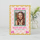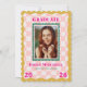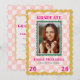Celebrate your graduate with this Rainbow Checkered Grad Announcement with Photo and Invitation, featuring a cute wavy checkered pattern in soft pastel pink. A bold, wavy frame in mustard color and a teal smaller frame to highlight the graduate’s photo, while bright pink typography emphasizes the school name and graduation year for a fun, modern look.
