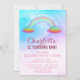 Fun Wolken und Regenbogengeburtstag Einladungen für 1. Geburtstag oder jedes Alter - Read 'Somewhere Over the Rainbow' oben in gekrümmten, weißen Buchstaben über einem funkelnd, Glitzer Effekt Regenbogen mit Aquarellfarben Regenbogenwolken an beiden Enden. Der personalisierte Name ist unten in eleganter, rosa Schrift mit Schatteneffekt und steht in moderner, passender rosafarbener Schrift "IS TURNING ONE". Hübsch, pastellfarbener Aquarell in Blau-, lila- und Rosatönen. Hinweis: Alle Bilder werden gedruckt. Kein tatsächlicher Glitzer. Individuell anpassbare Geburtstagsfeierinformationen, einschließlich UAWG, bedruckt in rosa Hauptstadt Buchstaben unten. Füllen Sie einfach Ihre eigenen Regenbogendetails mit der einfach zu bedienenden Textvorlage aus. Zurück hat einen passenden, rosa Himbeerrosa soliden Hintergrund, der in jede Farbe geändert werden kann. In unserem Zazzle.com/angela65 Shop haben wir sogar ein koordinierendes Baby Regenbogenoutfit und Party-Zubehör!