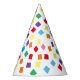 Rainbow Confetti Party mit einem fröhlichen Druck von hellen quadratischen und Diamantkonfetti Formen. Perfekter festlicher Papierkegel für die Geburtstagsparty eines Mädchens oder eines Jungen. Hübscher und fröhlicher hübscher gemusterter Hut, der Ihrem Event Freude bereitet.