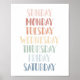 Stellen Sie Ihre Kinder den Wochentagen mit diesem handgeschriebenen Aquarellposter vor. Dekorieren Sie eine Mauer im Kinderzimmer, im Schlafzimmer oder im Spielzimmer Ihres Kleinen mit diesem Bildungspapier, um das Lernen im Alltag zu fördern.