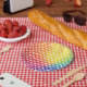 Rainbow-Kissen mit Punktmuster. Sie können das Hintergrundbild für ein anderes Aussehen ändern.