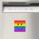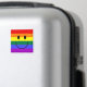 das Gesicht gegen die Streifen der Regenbogenflagge.
