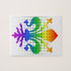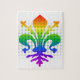Ein Regenbogen-Fleur-de-lis mit einem Fleur-de-lis-Hintergrundmuster.