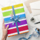 Auf diesem farbenfrohen Umhüllungspapier sind helle Regenbogenstreifen zu sehen.