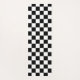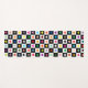 Eine gemusterte Yoga-Matte auf dem Trend mit schwarz-weißem Schachbrett mit einem Regenbogen aus farbigen Herzen auf der einen Seite und schlicht schwarz-weiß auf der anderen für das Retro-coole Skater-Ambiente mit mädchenhafter Drehung.
