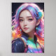 Eine junge Frau mit bunten pastellfarbenen Haaren und lebhaften Augen wird vor einem dunklen Hintergrund dargestellt, der von Licht gesprenkelt wird und einen Sternenhimmel nachahmt. Sie trägt eine Lederjacke, die einen farbenfrohen Regenbogen widerspiegelt und ist mit Accessoires wie einem Haarclip, einem flauschigen blauen Haargummi und schwindenden Ohrringen ausgestattet.