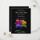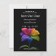 A striking Save the Date from the Technicolor Love collection, featuring the vibrant rainbow lily blooming in a full spectrum of colour against a dramatic black backdrop. The front highlights your names, date, and location with elegant clarity, framed by the bold, joyful energy of the rainbow lily.