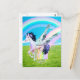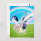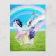 Ein digitales Bild eines farbenfrohen fliegenden Einhorns, das auf Gras landet, nachdem sie mit ihrer Magie Regenbögen am Himmel geschaffen hat.