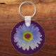 Dieser hübsche Schlüsselanhänger zeigt ein Foto einer riesigen Blume, die manipuliert wurde, um eine schöne Blume mit einer Farbmischung aus dem Regenbogen zu schaffen. Die Blume ist auf einem dramatischen, lila Hintergrund.