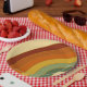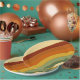 Retro Regenbogendesign. Regenbogenschichten in gedämpften Farben, orange, rot und grün. Groovy Retro 70er Regenbogengeschenke, Wohngestaltung.