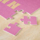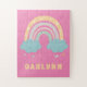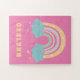Ein niedliches und skurriles Rätsel für ein kleines Mädchen, das viel Freude bringen wird, wenn sie ihren Namen sieht! Dieses Design zeigt eine Darstellung eines pastellfarbenen Regenbogens mit Wolken und Herzen, gelb, aquamarin und lila, auf einem rosa Hintergrund. Der Name des Kindes ist in kühlem gelben, spielerischen Schriftart. Ideal, um einem Kind beizubringen, seinen Namen zu erkennen und zu buchstabieren.