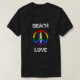 Friedenssymbol in klassischen Gay Pride-Farben auf einem schwarzen Männer-T - Shirt mit weißem Text im Graffiti-Stil. Strand und Liebe sind ein lustiges Spiel mit den Worten der Anti-Kriegs-Bewegung. Zeigen Sie etwas Stolz und verbreiten Sie Ihren Widerstand gegen den Krieg mit diesem bunten Design.