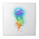 Große, rieszierende, künstlerisch gezeichnet, helle Quallen mit langen Tentakeln auf Weiß, mit farbenfrohen Aquarellbildern überstrichen. Rainbow-Quallen