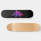 a colorful artwork of a stegosaurus silhouette in all the colors of the rainbow on a black skateboard.