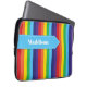 Der Laptop-Ärmel mit seinem hellen Regenbogen ist mit einem hellblauen Bannerband versehen, das über der Oberseite eine weiße Naht aufweist. Es ist mit einem Namen oder einem beliebigen Text personalisiert, den Sie gewollt haben.