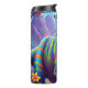 A magnificent T-Rex, adorned with striking horizontal stripes of rainbow colors including pink, green, and blue, roars powerfully in a vibrant jungle setting. Its red eyes and sharp teeth are prominent. Lush, fantastical plants and mystical rock formations under a bright sky complete this dynamic and artistic prehistoric scene.