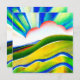 Digitales Aquarellbild in lebhaften Regenbogenfarben und -texturen mit Sonnenaufgang und hervorstehenden Sonnenstrahlen.