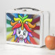 Diese Lunchbox hat ein Regenbogeneinhorn darauf.