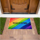 Rainbow Welcome Doormat. Dieses pulsierende Türmchen ist mit Aquarellstreifen in Regenbogenfarben und dem Wort Willkommen dekoriert. Sie können das Wort ändern, wenn Sie möchten. Original Wasserfarbe © Michele Davies.